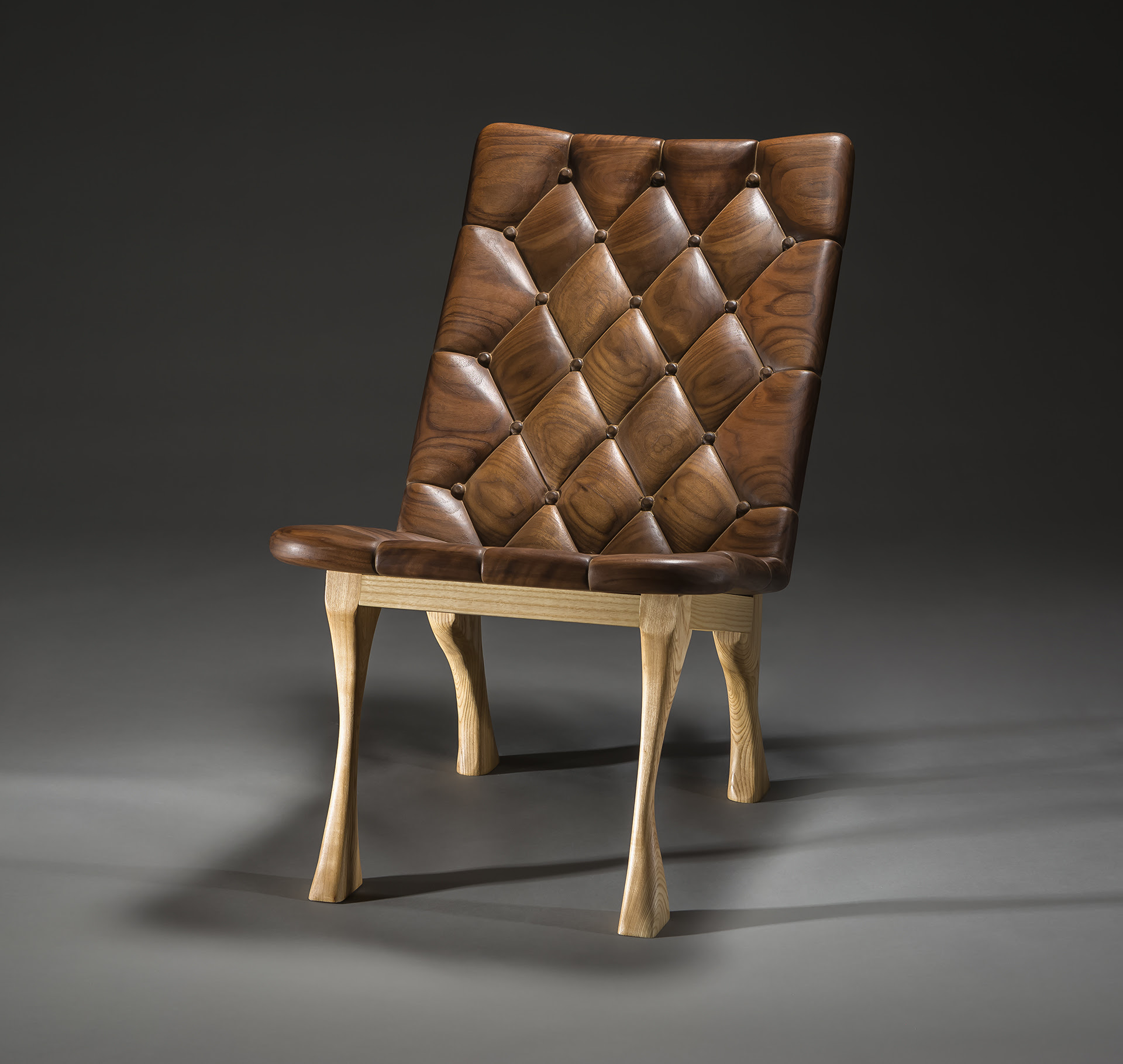 [Image: Seth Peter, Tufted Wood Chair, 2021. Black walnut, white ash. Photo by Andrea Rugg.]