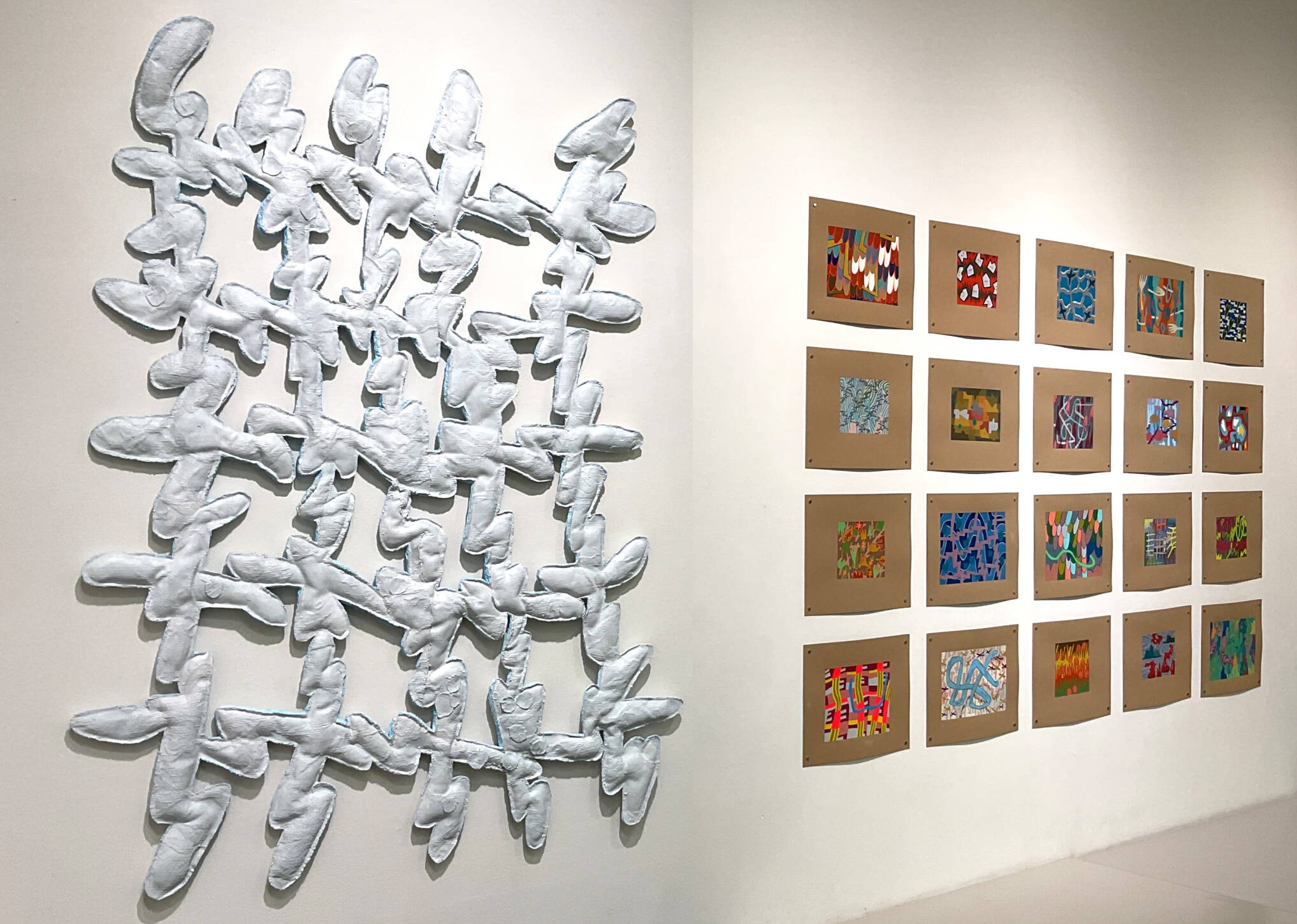 “Line Shape Color Shape Line” highlights the interdisciplinary and playful nature of Alice’s practice with a presentation of compact gouache paintings alongside textile-based sculptures created over the past five years. The selected works reflect Alice’s process-driven and meticulous yet intuitive and exploratory artmaking approach. The geometric, pattern-like paintings, all on uniformly-sized kraft paper, demonstrate Alice’s linework and dramatic chromatic vocabulary.