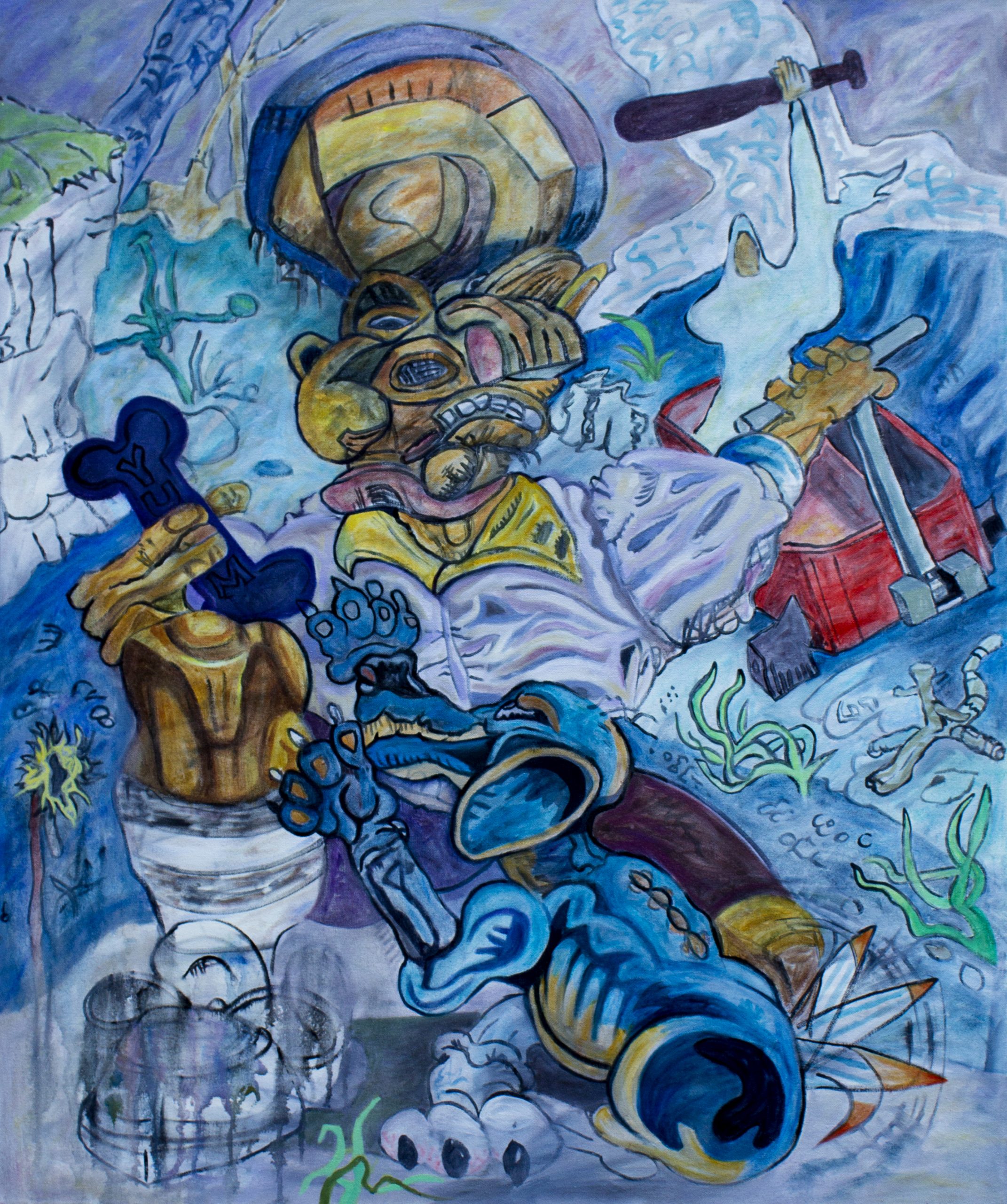 Native Memphian Roger Allan Cleaves is a painter and writer whose current work centers on “Forget Me Nots Land,” a fictional multiverse of his own creation. Launched by the artist in 2017, the “Forget Me Nots Land” series is a complex Afrofuturist fantasy that purposefully resists easy explanations and simple summaries. “A World on Fire” is the most recent chapter of this ongoing epic narrative. Cleaves’s colorful, abstract, and distorted figures and landscapes synthesize influences from the history of modernism including Cubism, Surrealism, and Pop, with the aesthetics of collage and comics.