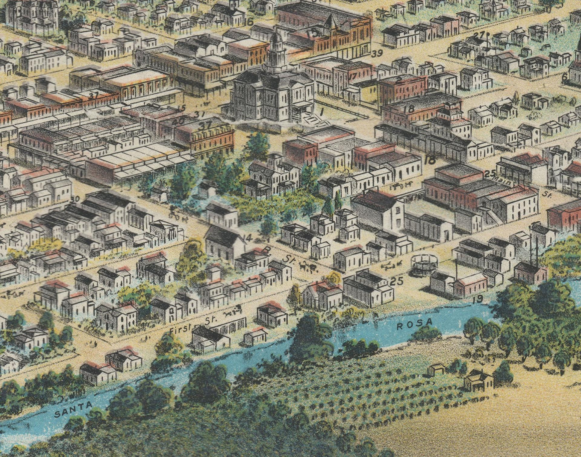 [Image: Santa Rosa map detail, 1897. Detail shows 1895 courthouse in the town center. Crocker chromolithograph, Museum of Sonoma County Collection.]